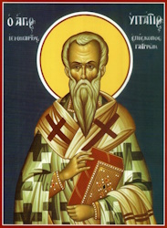 Когда святой возвращался на свой святительский престол, злые люди, последователи учения Новата*, будучи разжигаемы великою завистью на святителя Божия, устроили ему засаду на пути в узком проходе, на краю горной пропасти и на берегу болота, вооружившись мечами и кольями. [*Новат – пресвитер карфагенской церкви, живший в III в. и известный как основатель церковного раскола. Сущность этого раскола состоит в следующем: когда в 248 г. в Карфагене был избран епископом святой Киприан, пять пресвитеров, среди которых особенно выделялся Новат, недовольные этим избранием, отделились от Киприана, причем Новат, без ведома и воли епископа, поставил в диакона Фелициссима, человека богатого и влиятельного. Раскол тот в Церковной Истории известен под именем «раскола Новата и Фелициссима». Раскольники, отделившиеся от церкви, были осуждены на карфагенском соборе 251 г.] Как только он подошел к тому месту, они напали на него внезапно, устремившись, подобно диким зверям, и, сильно изранив его, сбросили с высокого берега в болотную топь. Святой, оставшись едва живым, простер руки немного кверху и, возведя очи на небо, как некогда святой первомученик Стефан, молился за убийц своих, говоря: «Господи! Не вмени им греха этого» (Деян.7:60). И когда он так молился, одна злая женщина, держащаяся Ариевой ереси, взяв увесистый камень, ударила им святого сильно по голове и убила его. Святая душа Ипатия, тотчас отрешившись от тела, отошла ко Господу*. [*Кончина святого мученика последовала около 326 г.] Убийцы, взяв тело святого, скрыли его в находящейся близ того места пещере и ушли.