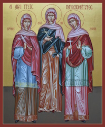 Так совершили свой страдальческий подвиг святые мученицы, три сестры, девы – Агапия, Хиония и Ирина и предстали со славою престолу Пресвятой Троицы – Отцу и Сыну и Святому Духу, Единому Богу, Ему же слава вовеки. Аминь.