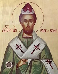 Святой Агапит, папа Римский*, был послан готским царем Теодорихом Великим**, владевшим тогда Италиею, в Константинополь к императору Юстиниану*** для переговоров о мире. [*Святой Агапит был папою римским с 535 по 536 г. **Теодорих Великий, король ост-готов, царствовал с 485 по 536 г. Ост-готы жили между реками Днепром и Доном и составляли восточную ветвь готского народа, распавшегося в IV столетии на остготов и вестготов. ***Император римский Юстиниан I царствовал с 527 по 565 г.] Отправившись, он встретил на пути человека, страдавшего двумя недугами – немого языком и хромого ногами. Взяв его за руку, святой Агапит исцелил его от хромоты; причастив же его Святых Тайн Тела и Крови Христовых, разрешил язык его.
