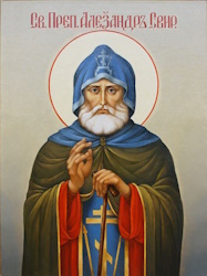 Яко многосветлая звезда днесь в странах российских возсиял еси отче, вселився в пустыню Христовым стопам последовати усердно возжелел еси, и того святое иго на Рамо твое взем честный крест, умертвил еси труды подвиг твоих телесная взыграния. Темже вопием ти: спаси стадо твое, еже собрал еси мудрее, да зовем ти: радуйся преподобне Александре, отче наш.
