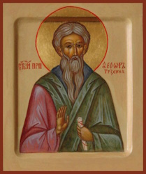 Преподобный Феодор Трихина, т. е. власяничник*, был сыном богатых родителей и происходил из города Константинополя. [*От греческого «трикс» – волос.] Оставивши для Бога родителей, и богатство, и славу, он удалился из отечества и принял монашество в одном пустынном монастыре.
