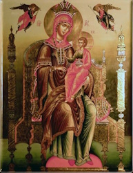 На этой древней почитаемой иконе Пресвятую Богородицу окружают Ангелы с пальмовыми ветвями в руках, а на полях изображены священномученик Антипа и мученица Фотиния.
